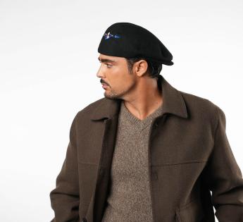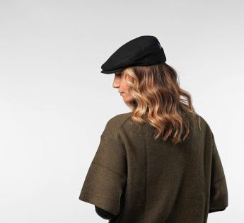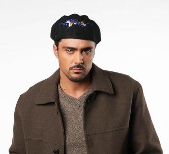 Flat cap revisited with an artistic and contemporary touch. On the back, an abstract embroidery in vibrant colors, imagined and crafted in our workshop, creates a striking contrast of shapes and materials.