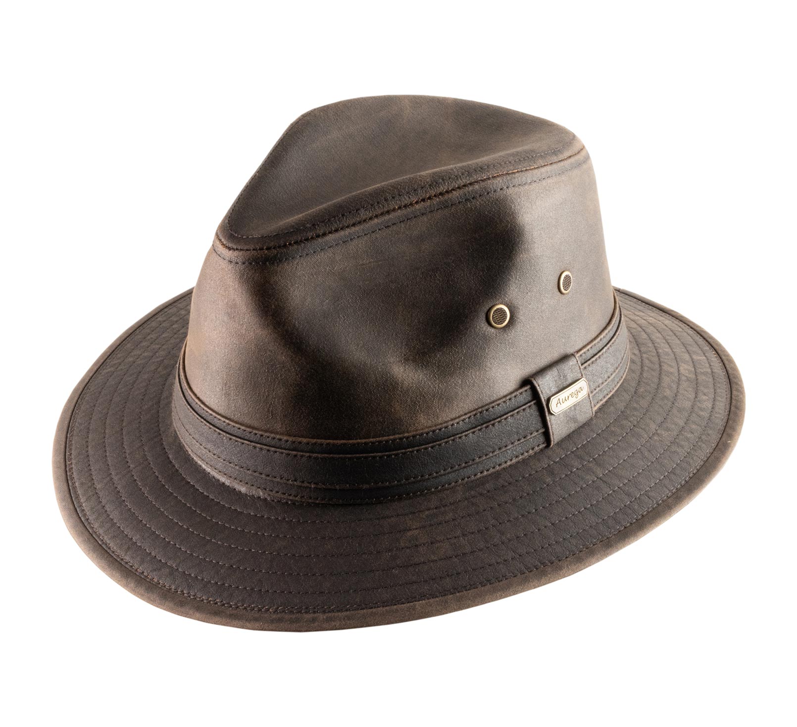 Traveller hat in a beautiful imitation of leather and through an aged effect. The crown is endowed with breathing eyelets to allow better breathability. The whole is of an adventurer style, robust and multipurpose to therefore accompany us in all our outdoor activities. The hat is above all protective with a welcomed waterproofness.