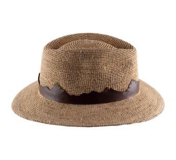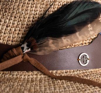 This Outback Hat in crocheted raffia stands out with its cut leather belt, whose raised design sketches a mountain range on the horizon. This masterful blend of materials—leather, suede, and natural feather—evokes the simple beauty of a wild landscape.