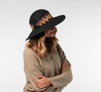 Floppy Hat in felted wool made in Italy, with a flexible and elegant silhouette. It stands out with a multicolored zigzag patterned trimming, adding a bohemian and bright touch to the ensemble. A striking play of textures for a hat full of personality.