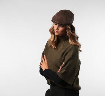 With its flexible material that feels like peach skin, this duckbill cap elegantly evokes the patina of aged leather. Its deep brown finish is subtly enlivened by a golden crackled pattern embroidered at the back, a nod to the art of kintsugi, where imperfection becomes precious.