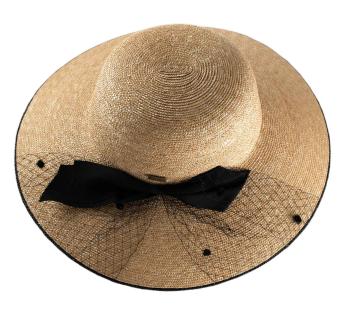 This hat exudes all the charm of feminine silhouettes. Its loose line, its finely woven straw, its tied ribbon and its delicate veil create a chic look, subtly vintage, full of grace and character.