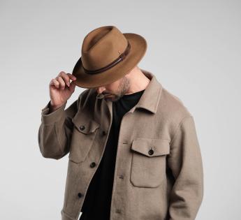 This wool felt outback hat by Alfonso D'Este combines style and functionality with elegance. Its soft yet durable felted wool provides ideal durability and protection for outdoor adventures. Its warm tone is enhanced by a contrasting leather band with delicate stitching.