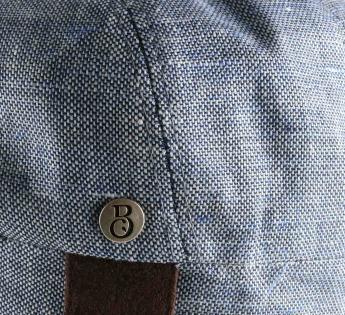In materials indispensable for the summer, this cap plays on the contrast between the blue color of its cloth and the beautiful faux leather of its visor and garnished button. The design reveals a Hatteras cap by its puff-out shape and an Irish one through its eight panels.