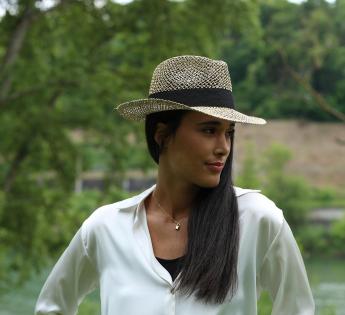 Very lightweight hat shaping a Fedora and which weaving has been realized to create daylights. So besides being refreshing, its brims are lowered on the front and on the back. This form gives the model an adventurous touch to make it easily accompany our outings under the sun. A black grosgrain braid is surrounding the crown and features a flat knot. The summer creation fits all genders, by the way.