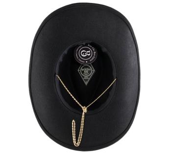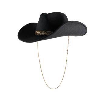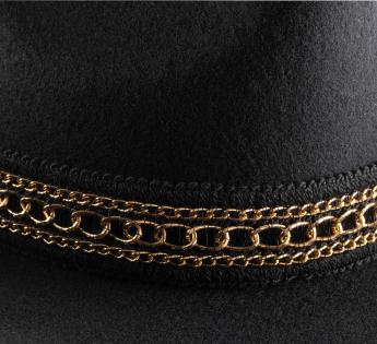 Crafted from wool felt, it is both warm, water resistant, and durable. The braid adorned with golden chains adds a luminous and contrasting touch, between classicism and audacity. The fine chin strap in chain style highlights its character and allows for a more secure wear.