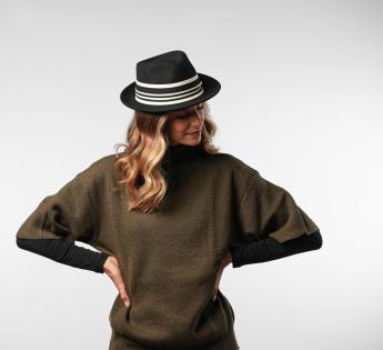 The perfect balance between sobriety and boldness, this Fedora hat with a mid-length brim captivates with its discreet shape, easy to adopt daily. Crafted from light yet warm felt, it is enhanced by an ultra-graphic braid combining textured knit, smooth satin, and contrasting finishes.