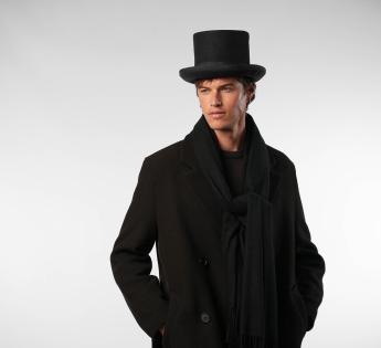 This top hat in hardened wool felt embodies elegance in its purest form. Its deliberately accentuated high crown creates a majestic vertical line, a signature of grand ceremonial silhouettes. The rigid felt, meticulously crafted, ensures impeccable hold and a refined finish.