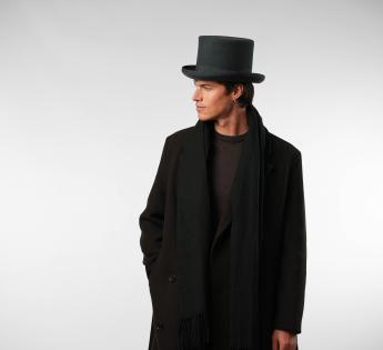 This top hat in hardened wool felt embodies elegance in its purest form. Its deliberately accentuated high crown creates a majestic vertical line, a signature of grand ceremonial silhouettes. The rigid felt, meticulously crafted, ensures impeccable hold and a refined finish.