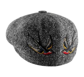 Flat cap with a subtle herringbone pattern, this piece blends authenticity with powerful symbolism. Water resistant and lined for added comfort, it is adorned with two swallow embroideries crafted in France—a nod to old school tattoo art. As a symbol of return, loyalty, and attachment to home, the swallow brings a poetic touch to this original creation.