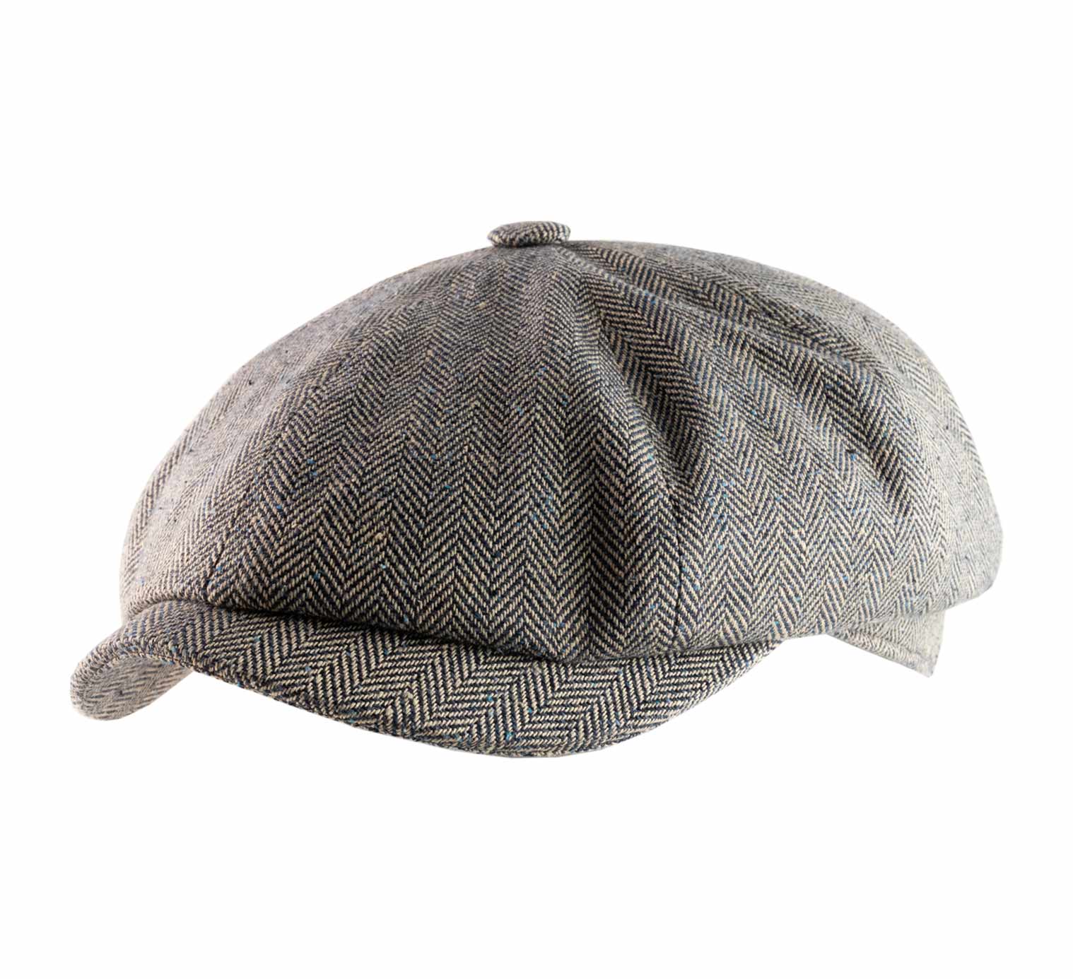 This cap enjoys a rather wide shape in a mottled herringbone pattern fabric, which adds a blue color touch to the creation.