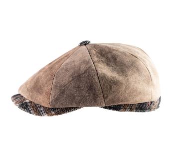 Flat cap with a crown made of 8 panels of suede leather (very soft reversed leather), which adds a charming touch. A play of textures is noticeable between the visor, the top part of the cap, and the snap button.