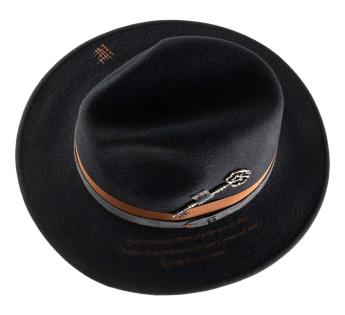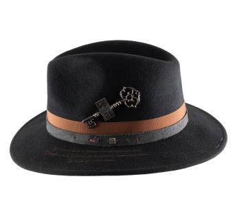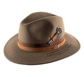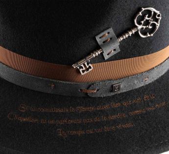 Entirely crafted from dense and structured wool felt, this model revisits the classic Outback Hat shape through a symbolic aesthetic inspired by the poetic universe of Lewis Carroll. An ancient key, fixed in place of the traditional feather, becomes the emblem of the mystery of time, a direct nod to the Mad Hatter from Alice.