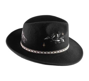 Fedora-shaped hat personalized with tattoo-style embroidery. The embroidery wraps around the crown, which is also adorned with a fine band featuring matching geometric patterns.
