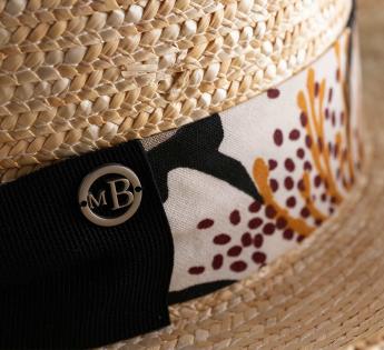 A hat of many facets, dancing with the summer light. Its ribbon, adorned with botanical patterns, plays with abstract, contrasting, and vibrant designs.
