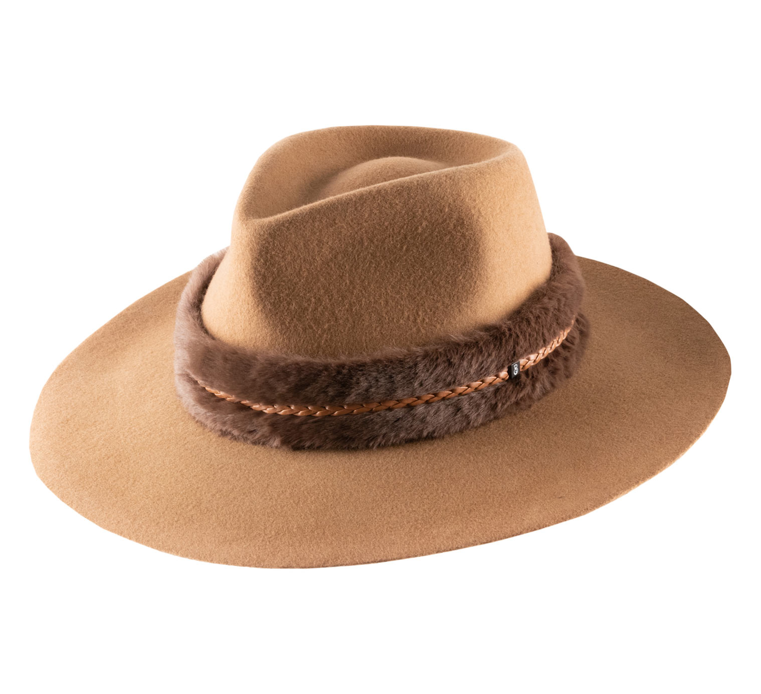 This is a Fedora shape with a wide brim to move closer to the Traveller and compose a model at the intersection of chic and adventure. The hat is made with wool and faux fur and decorated with a braid in order to constitute the perfect mix between elegance and the seventies spirit. It will offer us a really original look while matching ideally our outfits of the season.