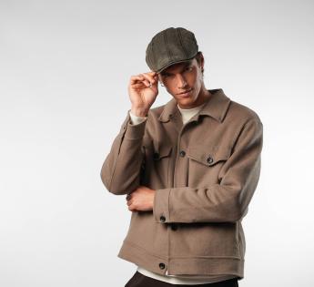 Waxed cotton flat cap. It gives the illusion of aged, patinated leather. Made from a technical fabric that combines the breathability of cotton with the durability of synthetic fibers, its warm color and soft texture give it a timeless character, perfect for those seeking an authentic yet refined style. The discreet metal emblem on the side emphasizes the quality and attention to detail.
