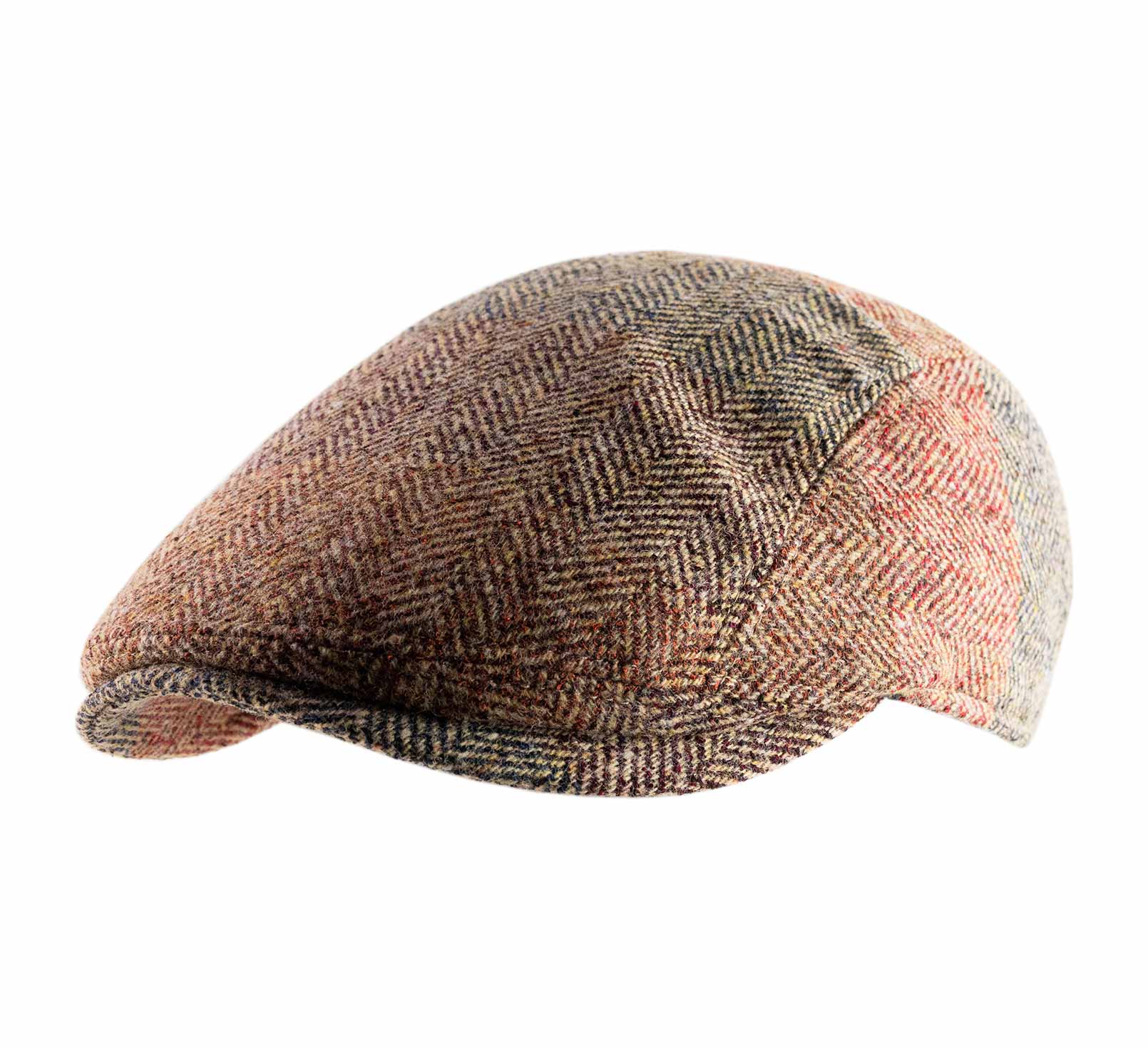 Flat cap with a tailored fit. It features a fine, colorful herringbone pattern and a leather Göttmann label at the back.