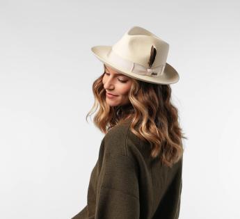 The mid-length brim, fully turned up, gives this Fedora Hat a soft and very modern line. Its sleek design gains character thanks to a natural feather subtly tucked into the grosgrain braid.