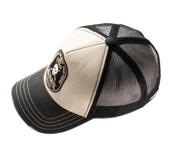 Netted cap inspired from the Kustom Kulture, that movement specialized and known for the hot rodding, car and motorbike customization. That universe reflects in this model, specially through the skull and crossbones embroidered patch that overhangs a distressed-effect visor. That adds originality to the model and offers us another option to show our personality.